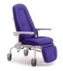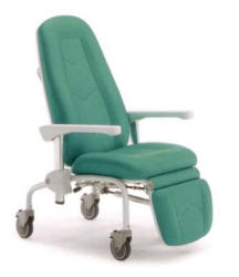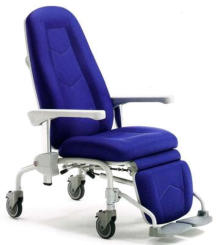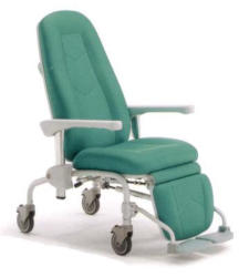 Tagespflegestuhl/Ruheliegesessel mit 4 Laufrollen Ø 125 mm, 2 mit Bremse.